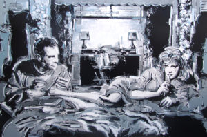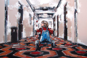 “Come lui si è ispirato all’arte io mi sono ispirato al cinema, e da qui nasce la mia idea di analizzare queste inquadrature e di trasformarle da un semplice frame ad un’opera d’arte. Ho iniziato ad analizzare il senso estetico di Kubrick decontestualizzando le immagini dai film, anche se ben ancorate ad un realismo oggettivo. Le sue pellicole sono il risultato di un lavoro di integrazione fra diversi canali comunicativi: la mostra si sviluppa quindi sulla realizzazione di tele che analizzano tutta la sua migliore produzione cinematografica, andando ad estrapolare e immortalare quelle immagini che caratterizzano i suoi film e che subito rendono riconoscibile il regista.”