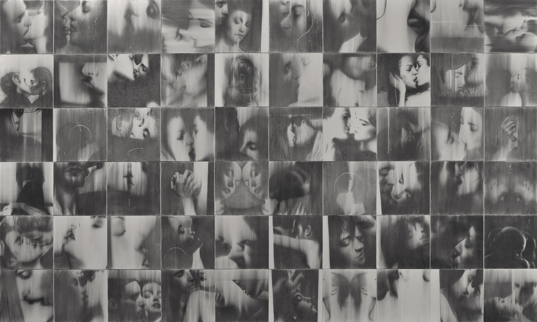 “L’insieme dei fotogrammi, rivisitati dalla mano dell’artista, mette in scena una sorta di dialettica della ripetizione lì dove una nuca, bocca, fronte, tempia e ancora altro, condividono il limite della propria forma nel momento in cui entrano in contatto con il loro alter ego che accanto si pone. La descrizione di questa ideale successione, nello spazio e nel tempo, di una umanità unita spiritualmente attraverso la vicinanza dei corpi, crea una condizione visiva contigua e continua che genera uno schieramento apparentemente in grado di respingere emotivamente la possibilità del distacco e dell’allontanamento”.