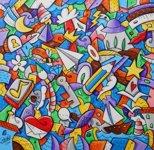 “Genesi – L’armonia del Kaos” ha lo scopo di approfondire l’arte e il linguaggio pittorico di SKIM, le cui opere vengono esposte e sono presenti nelle collezioni di tutta Europa e nel mondo. Attraverso una narrazione divisa in sezioni tematiche, l’esposizione ricostruisce il percorso che l’artista ha intrapreso sulla tela, a partire dai primissimi disegni che ne hanno segnato l’esordio fino alle opere più note che gli hanno permesso di affermarsi in tutto il mondo: opere raffiguranti “Personaggi” come arcimboldi moderni e “Omaggi” ai grandi maestri della pittura, ma soprattutto grandi universi armonici costellati di oggetti e particolari segni distintivi provenienti sia dal mondo della fantasia che dal nostro quotidiano, chiamati “Kaos”. Un’immersione totale nel mare della fantasia, in cui le forme e i colori insieme a piccole barchette, lettere, pennelli, matite e musica proiettano in una dimensione immaginaria in cui le figure varcano il limite fisico dalla tela e prendono letteralmente forma e vita.