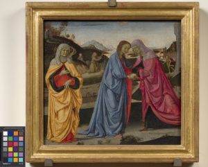 La piccola tavoletta de “La Visitazione”, i cui lati non superano i quarantacinque centimetri di lunghezza, fu realizzata probabilmente tra il 1473 e il 1474 con la tecnica della tempera su tavola. Scomparto di una predella oggi perduta, dopo il 1511 è documentata nel convento di suore domenicane della Crocetta a Firenze, anche se quasi certamente non era questa la sua destinazione originaria: per la presenza sullo sfondo di San Francesco che riceve le stimmate, si può invece ipotizzare che sia stata realizzata per un contesto francescano. Dal 1861 l’opera è custodita dalla Galleria dell’Accademia di Firenze, se si eccettua una breve parentesi tra il 1942 e il 1945, quando fu portata nel Castello di Montegufoni a Montespertoli, nei dintorni del capoluogo toscano, per proteggerla dagli eventi bellici.