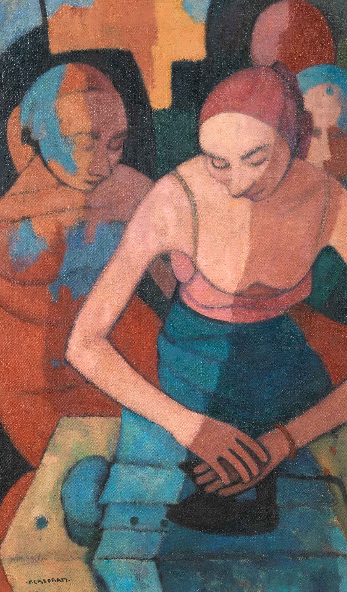 La figura umana la troviamo raffigurata anche nelle opere di Pompeo Borra, del quale la mostra espone Modelle (1936), dove l’artista milanese abbandona l’astrazione purista per avvicinarsi all’umanesimo di Piero della Francesca, e in Modèle devant le miroir dans l’atelier di Mario Cavaglieri, olio su tela del 1911, che ritrae – come suggerisce il titolo stesso – una donna di fronte allo specchio di un atelier, delineata attraverso una pittura rarefatta e raffinata. Troviamo, inoltre, Luce nella luce di Giacomo Balla, in cui il personaggio femminile è soltanto un pretesto per realizzare un gioco di riflessi e trasparenze che anticipa i soggetti più futuristi dell’autore, che prevarranno attorno alla metà degli anni Trenta. In Fanciulla bruna e Le stiratrici di Felice Casorati è evidente, invece, l’attenzione alla forma, come anche in Capanno al mare di Mario Tozzi: qui, tuttavia, le figure delle bagnanti raggiungono il massimo grado di sublimazione, diventano idoli, puri oggetti di contemplazione. Non sono soltanto impassibili, ma sono anche l’espressione di un enigma.