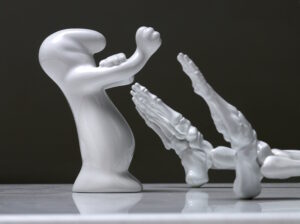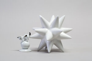 Le raffinate ceramiche di Salvatori raccontano microstorie sospese tra gioco e sofisticata ricerca formale. In Testone e Sono come pensieri dal piede pesante, hanno il piede pesante anche se abitano il cielo, la testa e il piede del David di Michelangelo, riprodotti con stupefacente minuzia, si svuotano della loro monumentalità per accogliere, come cavità da esplorare, delicate figure femminili. L’artista attinge al repertorio del ready made, trasformando statuine kitsch, oggetti di recupero e icone dell’arte in nuove narrazioni: una tartaruga che trascina un masso, un elefante intento a giocolare con sfere colorate, un gruppo di dame che danzano con il volto celato da vasi. L’ironia affiora in opere come lo scheletro irriso dal celebre personaggio de La Linea di Osvaldo Cavandoli. La sua ricerca unisce tradizione e sperimentazione: nella serie Ikebana Rock’n’Roll, l’uso della stampa 3D apre nuove possibilità espressive nel campo della ceramica.