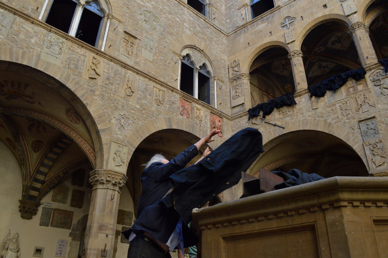 Sempre il 9 settembre (ore 21.00), nel cortile del Museo Nazionale del Bargello, inaugura l’installazione di Jannis Kounellis, opera simbolica e allegorica dove l’artista, con il suo linguaggio metaforico e poetico, coniuga il valore storico della libertà a un’estetica senza tempo. Il cortile del Museo del Bargello si trasformerà in un’opera d’arte: il punto dove si trova il pozzo verrà segnato da una simbolica x a indicare “l’ombelico” dello spazio. Sotto la croce, centro originario e cuore simbolico, sgorga l’acqua mentre sopra un cumolo di cappotti ricorda le sagome di figure umane, come corpi svuotati. Accompagnerà l’inaugurazione un concerto di Michele Marasco al flauto e Ciro Longobardi al pianoforte, su musiche di Giacinto Scelsi.