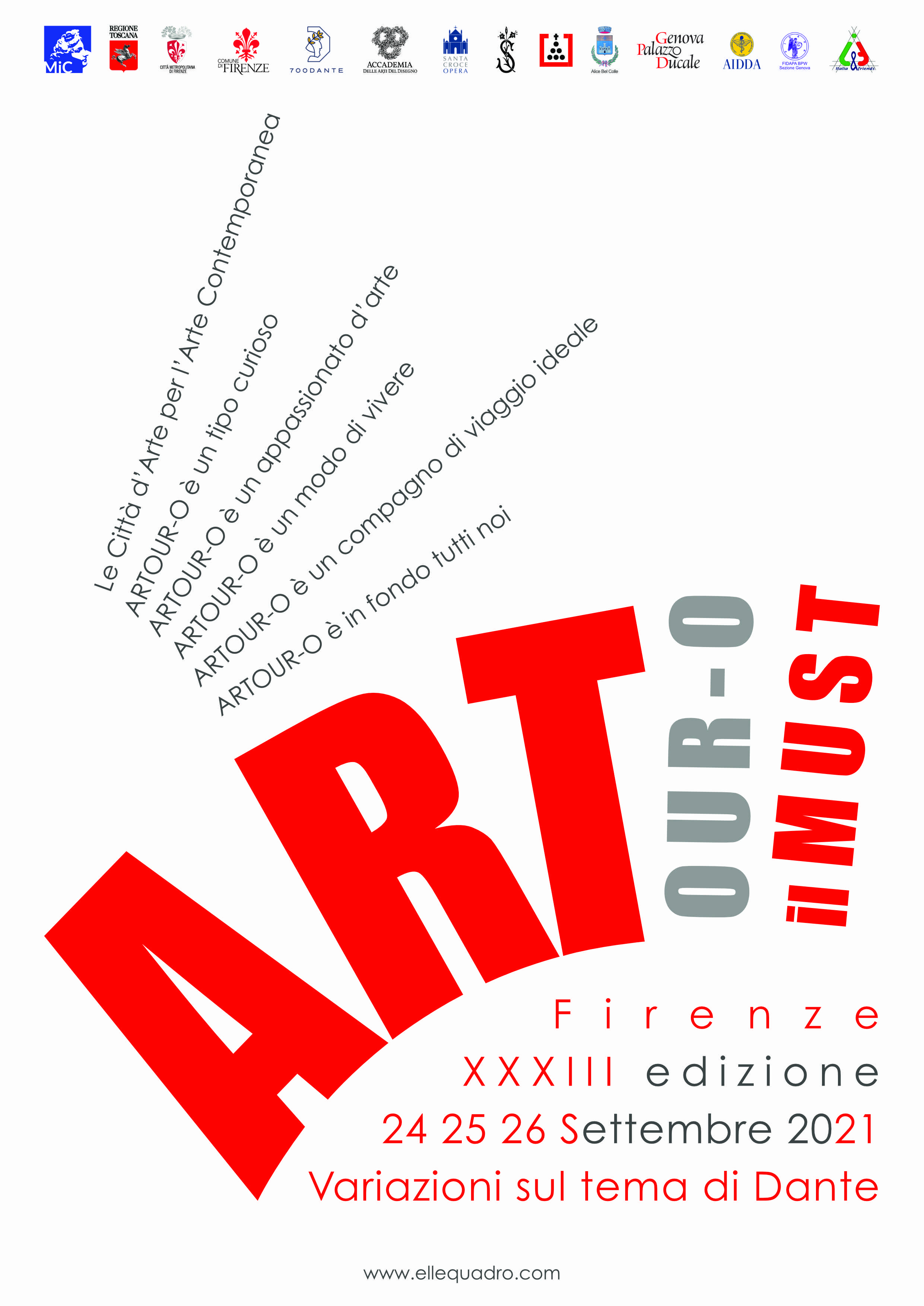 Dal 24 al 26 settembre 2021 torna a Firenze ARTOUR-O il MUST, il progetto creato dall’associazione Ellequadro Documenti per comunicare l’identità di aziende, istituzioni ed enti attraverso l’arte. Nata a Firenze nel 2005, la manifestazione è cresciuta negli anni, trasformandosi costantemente. Oggi ARTOUR-O il MUST, che racchiude nel suo nome le parole ART in TOUR MUSeo Temporaneo, torna nella “città dell’Arte” per eccellenza, con un Omaggio a Dante in occasione del Settecentenario. Questa XXXIII edizione della rassegna, infatti, ha visto 10 artisti impegnati nella realizzazione di 70 opere ciascuno, tutte ispirate al Sommo Poeta, 700 opere d’arte per 700 anni e 70 studi preparatori. Dal 24 al 26 settembre, 100 di queste creazioni saranno presentate in 10 luoghi della città, tra musei, spazi istituzionali ed altri prettamente aziendali, in una tre giorni di festa aperta a tutti. Come in ogni sua edizione, ARTOUR-O parlerà con il proprio lessico artistico anche di Economia e Lingua Italiana, affiancando come sempre momenti di creatività e di convivialità. Il progetto è realizzato con il Patrocinio del MIC Ministero della Cultura, Regione Toscana, Città Metropolitana di Firenze, Comune di FirenzeAccademia delle Arti del Disegno di Firenze e 700Dante.