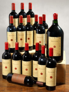 Il prestigioso Masseto, Tenuta dell’Ornellaia, è presente in catalogo con la doppia magnum, anno 1995, stimata 950 Euro e le 18 bottiglie dalla prima annata di produzione 1986 al 2010, stimate 4.000 Euro.