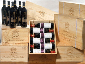 Da segnalare tra le prestigiose bottiglie della zona di Bordeaux un’importante selezione Chateau Mouton Rothschild del 1990, 1999, 2000, 2001, 2002, 2003, 2004 in casse intonse.