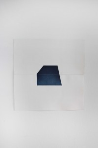 In Finestrino notte (su orizzonte piegato) vi è al centro una sagoma di finestrino (di un’auto) inchiostrato con blu scuro della notte. La sagoma è impressa sopra la carta piegata, e la linea bianca del foglio diventa così quella dell’orizzonte. L’orizzonte divide a metà sia il finestrino che l’intero spazio quadrato.