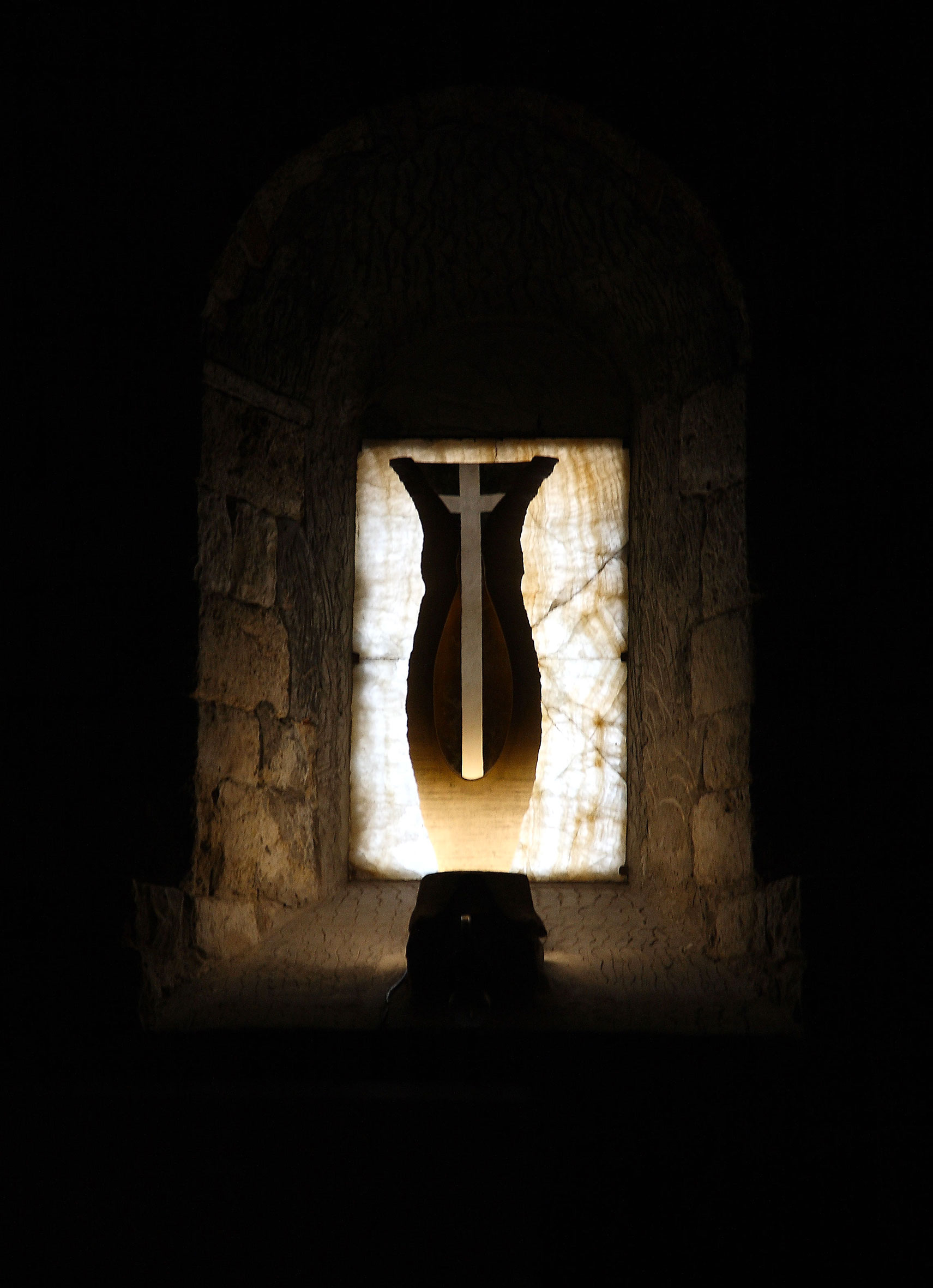 L’elemento Aria è evocato in Sonovasoro, vaso in alabastro e foglia d’oro, che contiene l’ombra della croce, posto dove la diagonale virtuale incrocia, sul finire del percorso, il vano della finestra dell’abside.