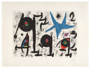 A New York, nel corso degli anni Quaranta, Miró continuò ad esplorare le tecniche calcografiche, ma sarà il mercante d’arte Aimé Maeght, dell’omonima galleria parigina, fondatore dell’Imprimerie ARTE (Arts et Techniques graphiques) e della rivista “Cahiers du miroir”, a farlo appassionare sempre di più al mondo della litografia, pubblicandone numerose incisioni singole, album e portfolio, ma anche manifesti, inviti, copertine di libri e persino cartoline postali.