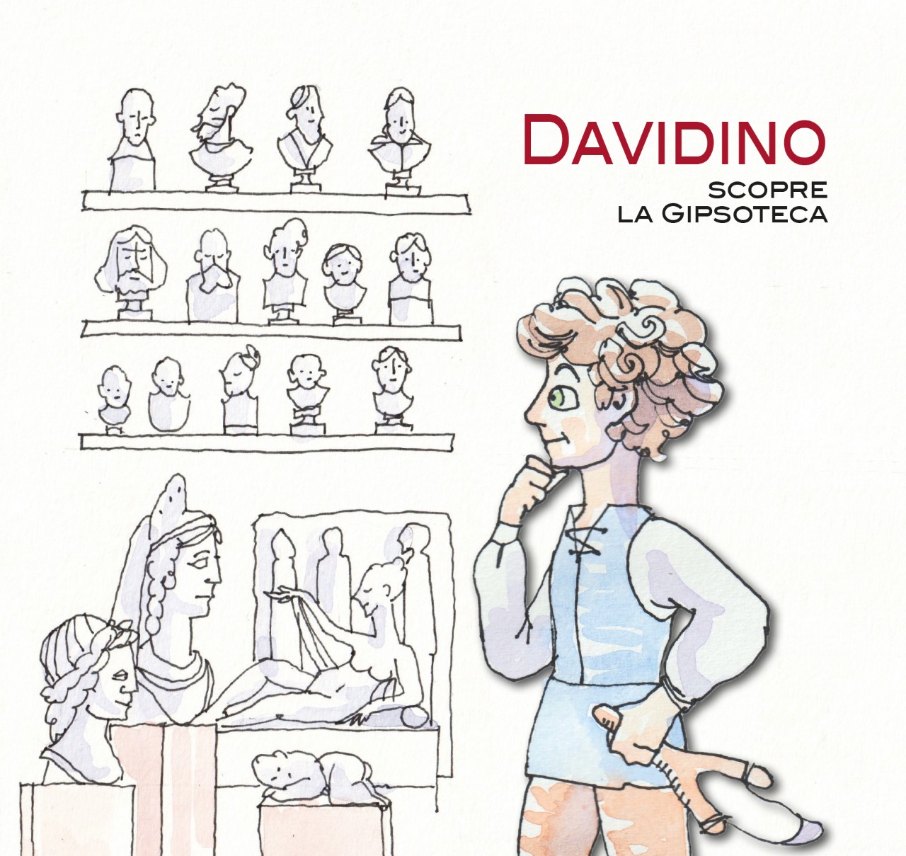 DAVIDINO scopre la Gipsoteca, con testi di Cecilie Hollberg e disegni di Paolo Fiumi, è una pubblicazione che si rivolge ai più piccoli per introdurli alla collezione della Gipsoteca, alla sua storia, alle sue opere e come sono state create, ai personaggi ritratti. E lo fa in modo divertente e animato attraverso l’incontro del fanciullo Davidino e lo scultore Lorenzo Bartolini, che lo accompagna in visita nell’affascinante mondo dell’Ottocento.