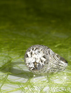 Tra i gioielli, spicca un bellissimo anello degli anni ’20 in platino e diamanti con brillante centrale di 7 carati circa ( stima 18.000-22.000 euro, foto 2430) e una demi-parure, della fine del secolo XIX, in oro rosa, argento e diamanti, composta da una collana e un paio di orecchini pendenti, conservati in astuccio dell’epoca (stima 6.000-8.000, foto 2425).