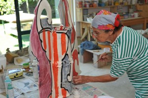 L’incontro di Betty Woodman con l’argilla risale agli anni Cinquanta: l’impasto di terra e acqua ha sempre rappresentato il rapporto più stretto tra l’artista e la sua opera, senza tutte le mediazioni tecniche e strumentali che richiedono invece la pittura o la scultura. Quando nel 1951, poco più che ventenne, scoprì Firenze, scoprì anche gli innumerevoli usi dell’argilla impastata e cotta: dalla produzione etrusca e romana, che trovò nei musei, alle robbiane che incontrò nei tanti tabernacoli della città, sino ai vari oggetti della tradizione toscana, dai coppi dei tetti sino ai grandi vasi che vedeva nei giardini delle ville. E la città è entrata nel suo lavoro e anche nel suo cuore, tanto che dopo avervi soggiornato per lunghi periodi negli anni Sessanta, ha deciso alla fine di comprarci una casa, all’Antella, dove passa ogni anno la primavera e l’estate. Gli altri sei mesi dell’anno li trascorre a New York, dove nel 2006 ha realizzato un’importante mostra al Metropolitan Museum.