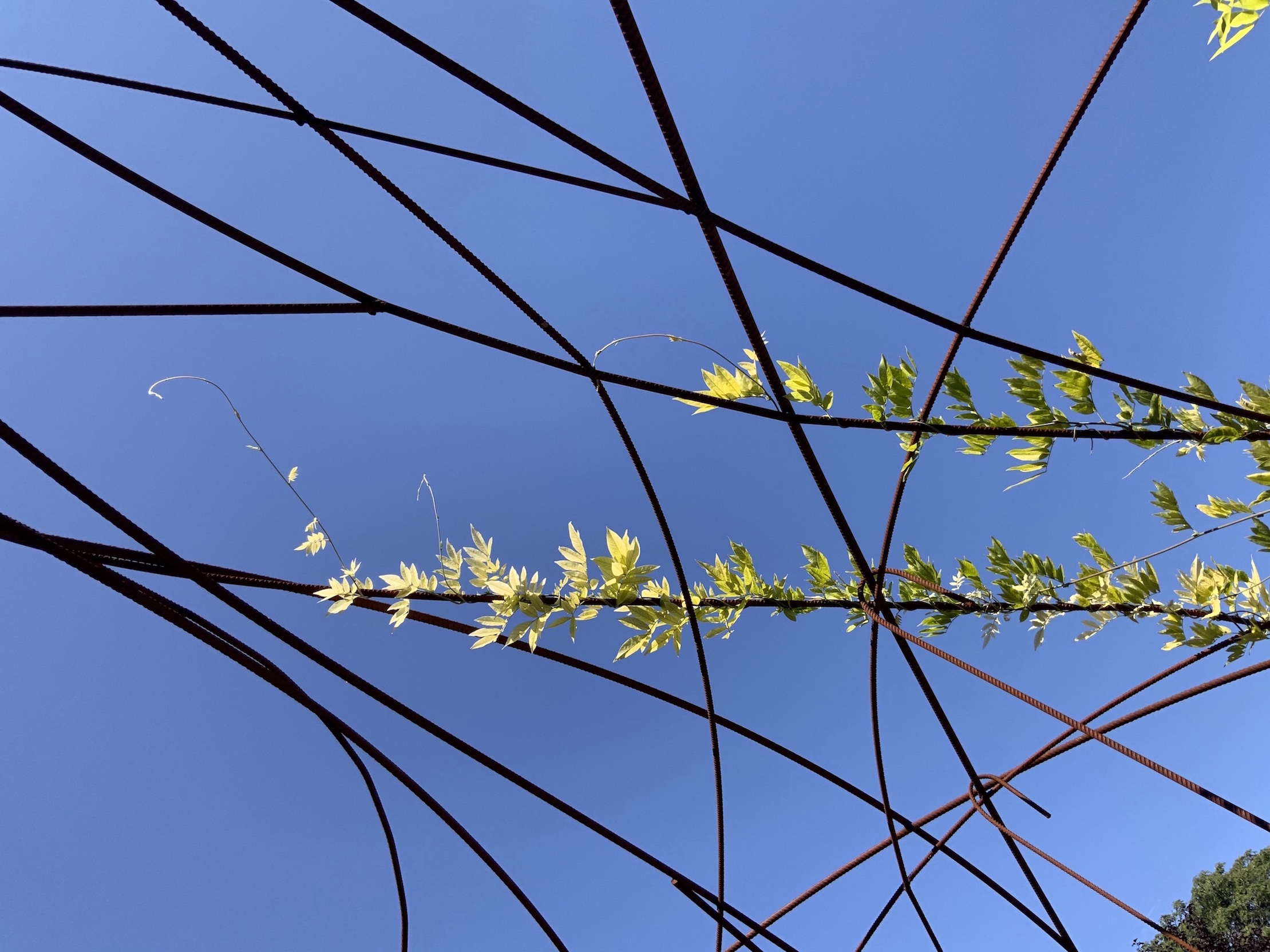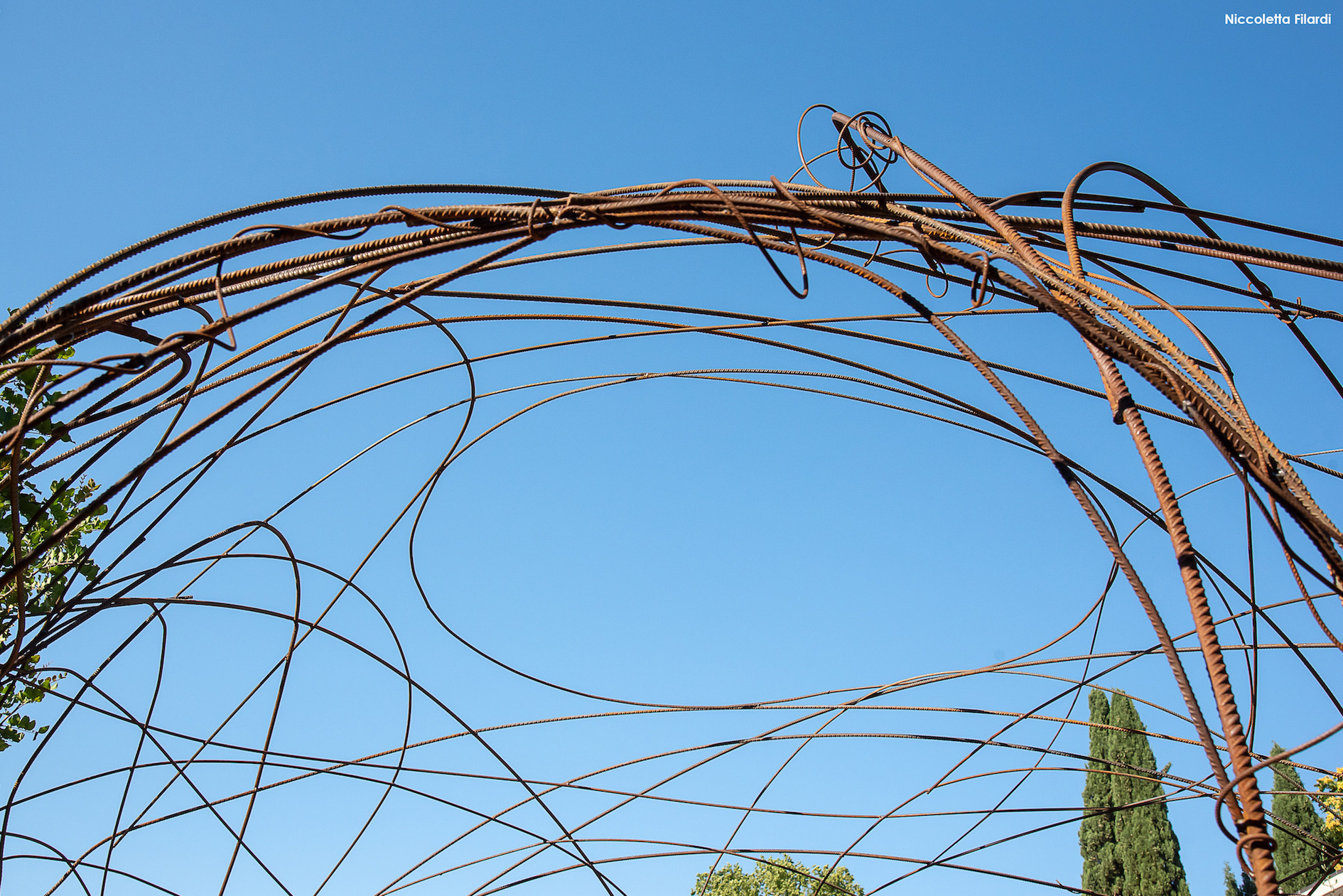 Si presenta come una cupola, la monumentale installazione di Matteo Baroni Opera Viva, realizzata alle Serre Torrigiani, all’interno dell’omonimo giardino all’italiana nel cuore di Firenze. Una sorta di chiosco fatto di tondini di ferro, “vivo” perché creato per integrarsi con l’ambiente circostante, che viene presentato oggi al pubblico. Appena costruito, come un antico pergolato di campagna o come la pagoda arabescata di un elegante giardino liberty, ha iniziato a coprirsi di rampicanti: i kiwi – gli unici in città – pieni di frutti in estate; i glicini di vario tipo che lo hanno riempito di colore a primavera e poi, quasi in estate, i bianchi gelsomini.