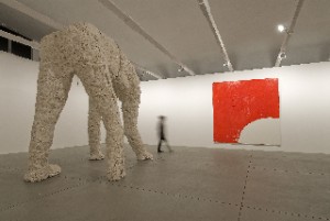 L’arte di Gianni Dessì, considerato uno degli interpreti più significativi dell’astrattismo contemporaneo, si nutre di colore, materia, gesto, luce e simboli. È una sperimentazione linguistica tra pigmento e materiali anomali, è un gioco pittorico dove l’analisi cromatica coincide con una nuova visione luminosa e spaziale, e dove ogni costruzione compositiva ruota, come fosse perno, intorno a un simbolo, figura astrattamente enigmatica, misteriosa, segreto da codificare. Nella sala centrale sono poste tre opere in vetroresina, anche queste di grandi dimensioni, incorniciate da un bordo, rispettivamente blu, rosso e nero. I lavori in vetroresina, ai quali nell’ampia retrospettiva al MACRO di Roma del 2006 è stata dedicata un’intera sala, testimoniano un’importante evoluzione stilistica nella poetica dell’artista, sia dal punto di vista formale che dal punto di vista narrativo. C’è una contaminazione tra pittura e scultura, forme geometriche nette sono dipinte sulle superfici estendendosi anche alle pareti, all’architettura dei luoghi dove s’inseriscono. Già nei testi del volume pubblicato nell’occasione della mostra al MACRO, curata da Danilo Eccher, si sottolineava come in queste opere si avvertisse una nuova drammaturgia, una nuova teatralità occulta, una monumentalità carica di tensioni e conflitti. La materia crea superfici misteriose e indecifrabili, l’ambiguità sta anche nella consistenza della vetroresina solida, resistente, elastica che, nella sua trasparenza appena accennata, tradisce un’origine liquida e viscosa, una sorta di umore vitreo. L’ultima sala della galleria Bagnai è occupata da un’enorme scultura completamente bianca, una grande figura umana apparentemente senza testa (in realtà la testa è accennata dipinta in rosso sul muro) che appoggia le mani a terra, creando tre archi attraversabili. La scultura è un corpo che si fa architettura, disegna un varco, una soglia, un accesso tra pieno e vuoto, dimensiona lo spazio nella gravità della “misura”; peso reale e virtualità della pittura. In questa zona liminare, sembra collocarsi lo sguardo dell’artista – come lo stesso Dessì scrive – nei confronti della pittura intesa come un tutto da abitare, esperire ed interpretare. In contemporanea con la mostra è in uscita l’ultima fatica di Sergio Rubini “Colpo d’occhio”, interpretato da Riccardo Scamarcio, per la quale Dessì ha creato e prestato opere divenute parte integrate della storia del film. Di notevole rilievo si segnala inoltre, la collaborazione di Gianni Dessì alla creazione della scenografia dell’opera “Il Castello del Duca Barba Blu”, di Bela Bartock, per la regia di Peter Stein, diretta da Daniel Harding, in programma al Teatro la Scala di Milano il prossimo maggio. L’arte di Gianni Dessì è un’arte colta e vitale, che non può essere solo vista ma anche ‘sentita’.
