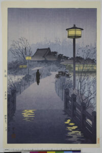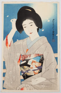 Dopo il sisma, la produzione delle incisioni shinhanga si intensifica al ritmo frenetico della ricostruzione urbana, assorbe la nuova atmosfera e la racconta in una produzione sempre più diversificata. Agli scorci caratteristici si aggiungono angoli metropolitani con strade deserte, case dalle cui finestre filtra un’illuminazione densa e artificiale; nelle opere si nota adesso l’assenza di figure umane, prevalgono pioggia e neve a simboleggiare la lotta dell’umanità con gli elementi naturali. Tutto, nelle xilografie prodotte dopo il disastro, racconta il senso di smarrimento e la solitudine dell’individuo di fronte alla fragilità dell’esistenza. Allo stesso modo, nei bijinga si affievolisce ulteriormente, fino a scomparire del tutto, il nesso con il mondo dell’intrattenimento notturno tipico dell’ukiyoe. Le ragazze immortalate nelle illustrazioni non soltanto sono donne comuni, ma iniziano a muoversi anche al di fuori delle mura domestiche, nelle vie o nei locali dei quartieri alla moda: sono cameriere, insegnanti, infermiere e dattilografe, giovani indipendenti e istruite, emancipate, pronte a cogliere le numerose opportunità che il nuovo Giappone offre loro.