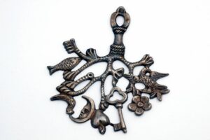 La mostra presenta poi una serie di oggetti originali legati al mondo della stregoneria. Dal notissimo Museum of Witchcraft and Magic di Boscastle, in Cornovaglia, arrivano antichi calderoni, feticci, amuleti, talismani e bacchette magiche. Tra le altre ne spicca una, lasciata in eredità da un negromante locale, fatta in legno di sambuco, che sappiamo essere, anche grazie alle pagine di Harry Potter, la più potente delle bacchette esistenti, capace di imprese magiche straordinarie. Il Museo delle Civiltà di Roma, invece, ci ha aperto il suo incredibile caveau nel quale, tra le tante cose, è conservata una incredibile collezione di amuleti, che raccoglie oggetti provenienti da diverse regioni d’Italia, realizzati in vari manufatti nel corso dell’Ottocento e confluiti nella prima grande mostra etnografica d’Italia del 1911, che ha dato poi vita al museo romano, e da allora mai più proposta al pubblico. Tra tante meraviglie in argento, veri e propri gioielli, ci sono amuleti più poveri, ma non per questo di minor valore. Tra i più incredibili, si segnala la famosa carta manoscritta trovata, alla sua morte, nello scapolare della strega Conti, in Toscana, databile intorno alla fine dell’Ottocento.
