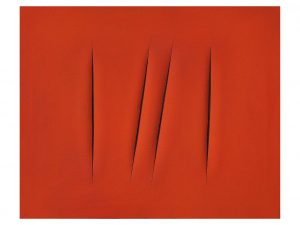 Si prosegue al piano terra con un’ampia selezione di opere moderne e contemporanee. Lucio Fontana è stato un artista con cui la Tornabuoni Arte ha sempre avuto un rapporto speciale, e in questa antologia troviamo ben cinque suoi capolavori come, fra tutti, Concetto spaziale, Attese, 1965-66, dove l’azione solenne di quattro tagli si imprime sulla tela rossa. Relativamente al contesto dell’Arte Povera, sono in mostra esempi come: Non resto non parto non parto non resto di Alighiero Boetti, del 1979, realizzata con la penna biro, secondo il principio espresso da Boetti stesso che “si può usare tutto per fare arte senza nessuna gerarchia”; e Senza titolo (2010-2011) di Jannis Kounellis, un lavoro a parete, composto da una lastra di derivazione industriale sulla quale è sospeso, in una rete metallica, un violino, la dimensione impalpabile della musica evocata dalla memoria emotiva del suono dello strumento musicale si contrappone, qui, alla fredda e solida materia che lo contiene.