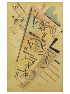 Chiude l’esposizione, una sezione dedicata agli artisti internazionali. Di Wassily Kandinsky – che Sonia Zampini ricorda nel titolo del suo saggio nell’Antologia, La linea evolutiva dell’arte – si può ammirare Communiqué, del 1936, realizzato durante il suo soggiorno a Neuilly-sur-Seine, vicino Parigi, quando il pittore tornò a dipingere acquerelli. Sempre su carta è lo splendido Femme dans la nuit di Joan Mirò (1966), un intimo soliloquio carico di malinconia esistenziale, dove la figura femminile posta a destra del campo visivo, descritta con la sapienza di linee agili e modellanti, si rivolge alla grande stella che domina il cielo. Risalgono, invece, agli anni ’80, le opere del fondatore dell’Op art, Victor Vaserely, Dinn, 1984, Tizenne 2, 1986.