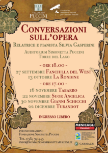 Le Conversazioni sull’opera non si fermano. Dopo gli incontri dedicati a Le Villi, Edgar, Manon Lescaut, La Bohème, Tosca e Madama Butterfly, che hanno animato i pomeriggi estivi all’Auditorium Simonetta Puccini di Torre del Lago, la rassegna ideata e organizzata dalla Fondazione Simonetta Puccini prosegue con sei nuovi appuntamenti che, da venerdì 27 settembre a domenica 22 dicembre 2024, permetteranno al pubblico di conoscere e approfondire altri grandi capolavori pucciniani, quelli della piena maturità del Maestro: La Fanciulla del West, La Rondine, Il Tabarro, Suor Angelica, Gianni Schicchi e l’incompiuta Turandot. Sul palco, a condurre le serate, che si svolgeranno come sempre presso l’Auditorium Simonetta Puccini, sarà Silvia Gasperini, pianista in numerosi concerti lirici in Italia e all’estero, che insieme a tenori e soprano di fama internazionale eseguirà brani e arie tratti dai melodrammi, illustrandone i passaggi musicali e commentando le parti salienti dei libretti d’opera. Tutti gli incontri sono ad ingresso libero e gratuito.
