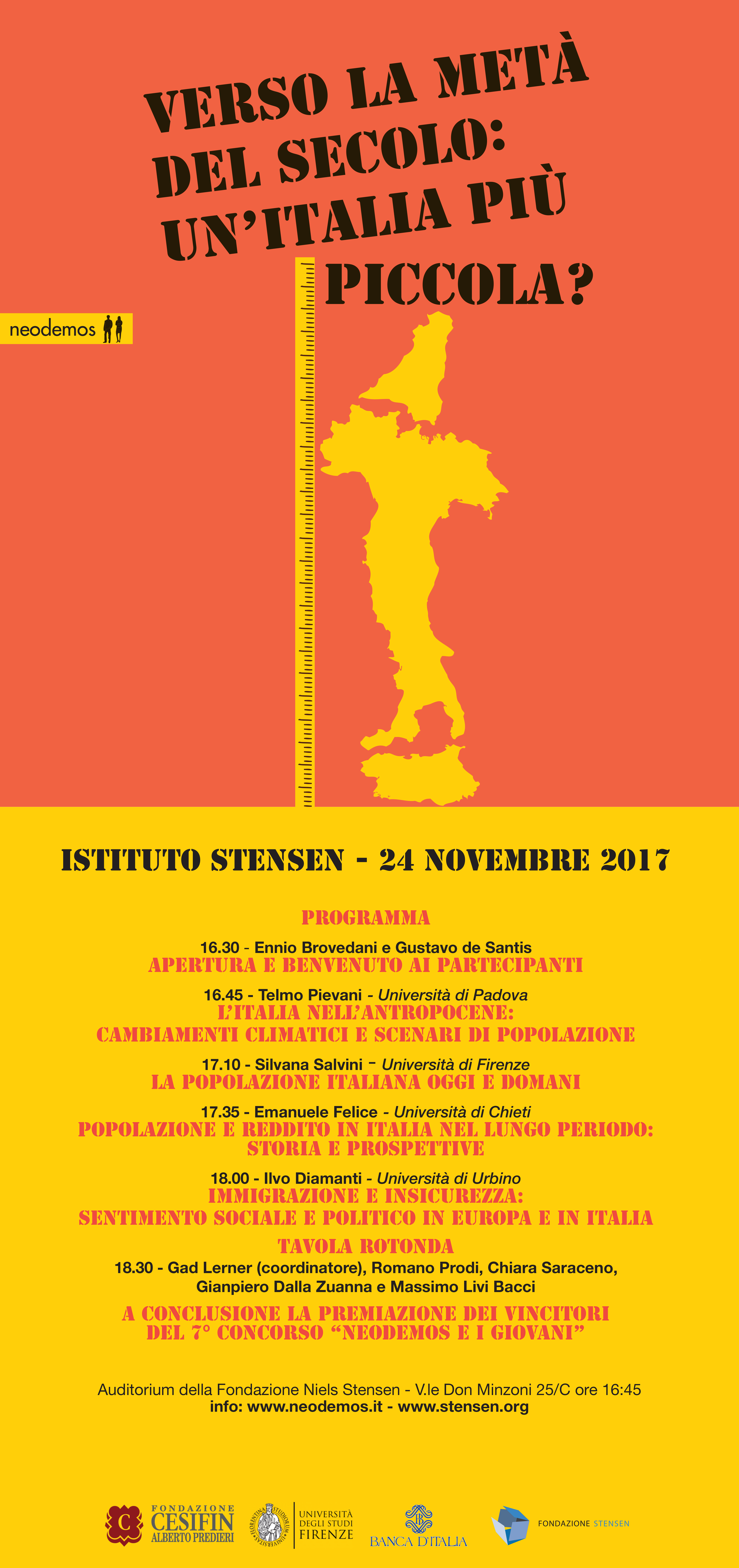 L’associazione Neodemos compie dieci anni. Dieci anni dedicati alla buona e seria divulgazione degli studi e delle analisi delle relazioni tra tendenze demografiche e società, economia e politica. Dalla sua nascita ad oggi l’associazione ha pubblicato, sul proprio sito, circa mille contributi e numerosi ebook tematici, ha organizzato incontri e convegni e ha partecipato a numerose iniziative scientifiche. Per festeggiare questo anniversario, il 24 novembre 2017 alle 16.30, Neodemos organizza, in collaborazione con la fondazione CESIFIN e con l’Istituto Niels Stensen, la giornata di studi “Verso la metà del secolo. Un’Italia più piccola?”. All’incontro, che si terrà all’Istituto Stensen di Firenze (viale don Minzoni 25c), parteciperanno Ilvo Diamanti, Emanuele Felice, Telmo Pievani e Silvana Salvini. Al termine, Gad Lerner condurrà una tavola rotonda sui principali aspetti emersi dalle relazioni con Romano Prodi, Chiara Saraceno, Gianpiero Dalla Zuanna e Massimo Livi Bacci.